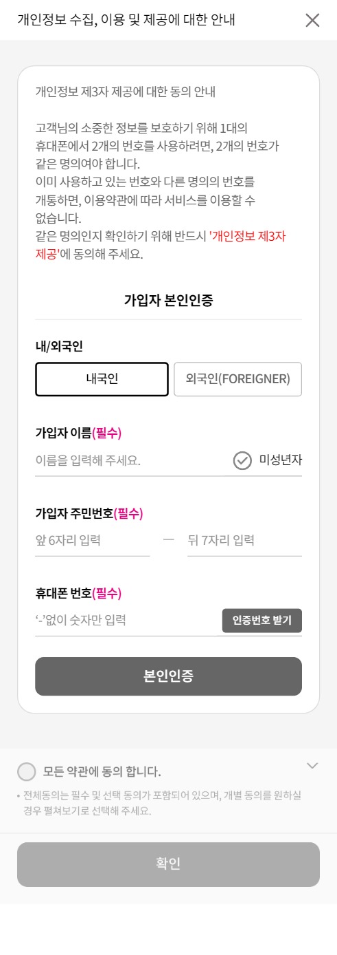 본인확인이 안될 경우 사용이 제한되는 것이 모든 통신사 공통.