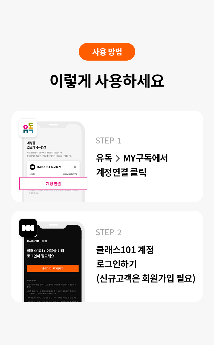 결제 후 MY 구독에서 계정을 연결한 뒤, 클래스 101 계정으로 로그인하여 사용하시면 됩니다.