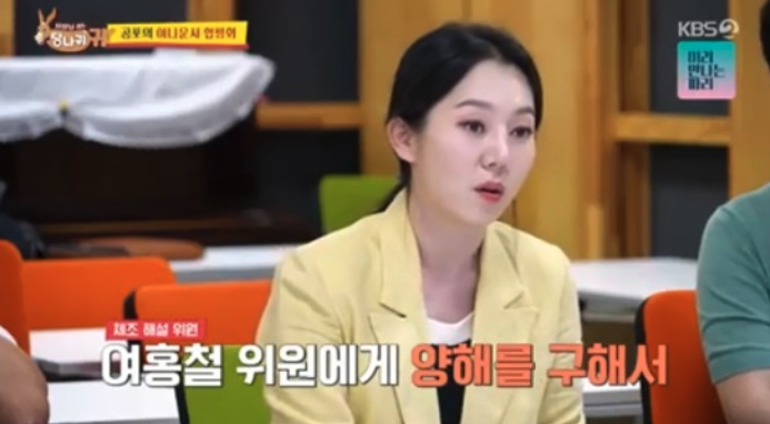 21일 방송된 KBS 예능 '사장님 귀는 당나귀 귀' 에서 선배 아나운서들과 함께 합평회를 하는 모습이 방송에 담겼는데요, 엄지인 아나운서는 홍주연 아나운서에게 체조 해설위원 여홍철 위원과의 즉석 전화 인터뷰 미션을 전달했습니다. 홍주연 아나운서는 이에 여홍철 해설위원의 첫 해설 시기를 언급하다가 틀리는 등 첫 질문부터 실수를 하고 말았습니다.
